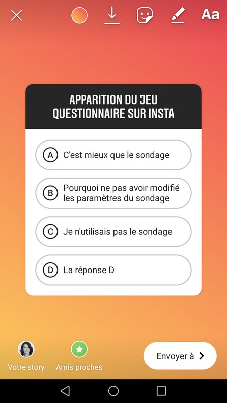 Fin avril, un nouveau sticker a fait son apparition dans les stories : le jeu-questionnaire. Il s’agit en fait d’un quizz avec 2 à 4 réponses possibles. On paramètre la bonne réponse et on laisse jouer sa communauté.